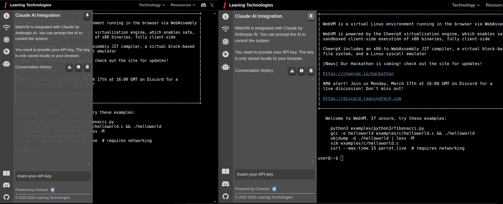 If you want to build a product on top of CheerpX/WebVM, please get in touch: sales@leaningtech.com